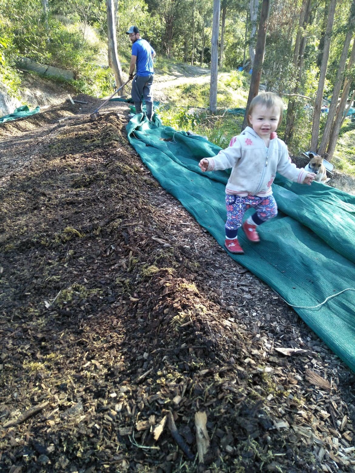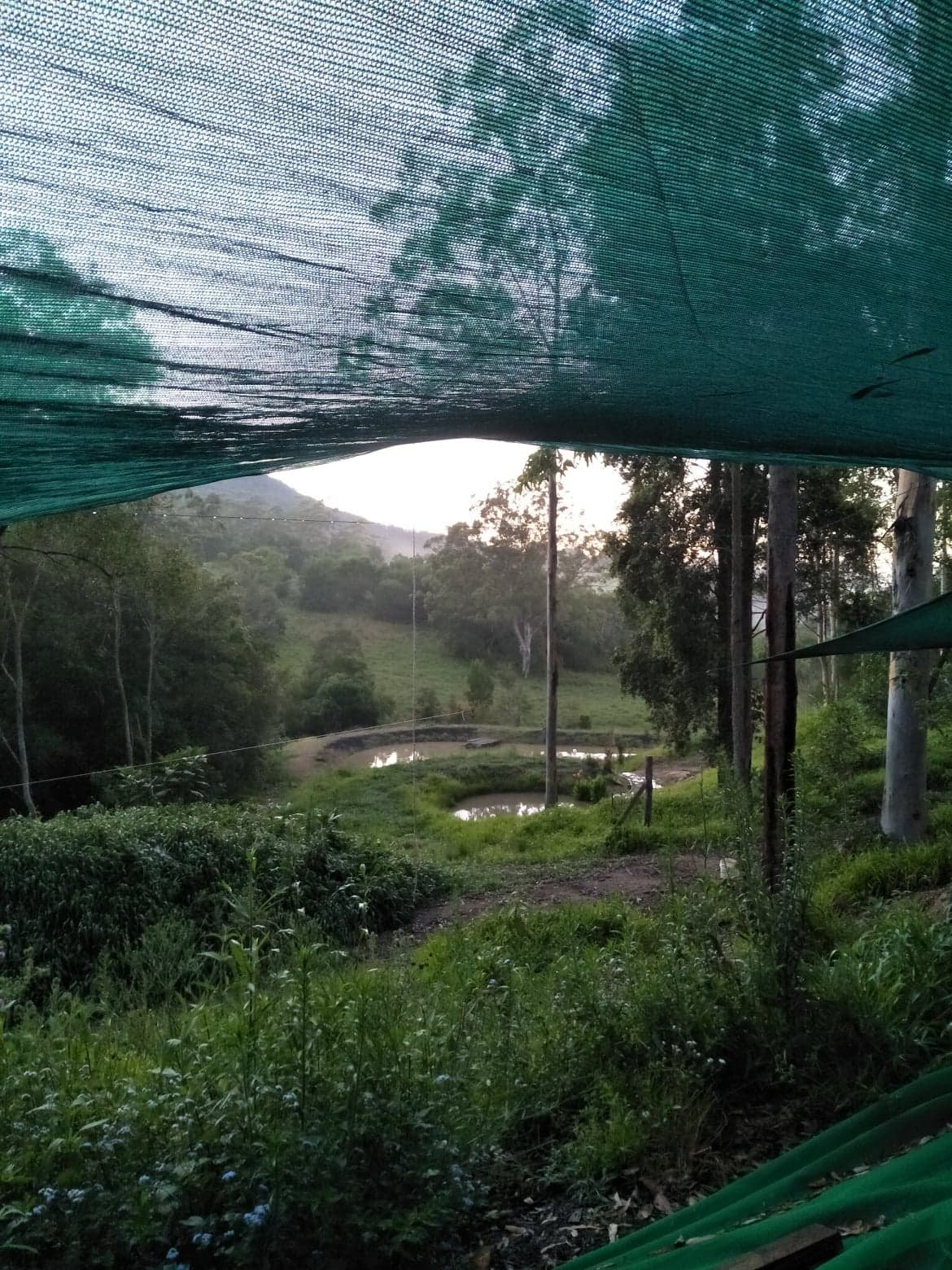 As summer approached Pete had to psych himself up to the yearly task of rigging up the shade cloth on the new terraces to protect the windrows (worm beds) from the harsh sun. About 30 rolls of 20m cord and 300m of shade cloth later, its done! With only one spill off the side of the ladder the worms and Pete are very happy!